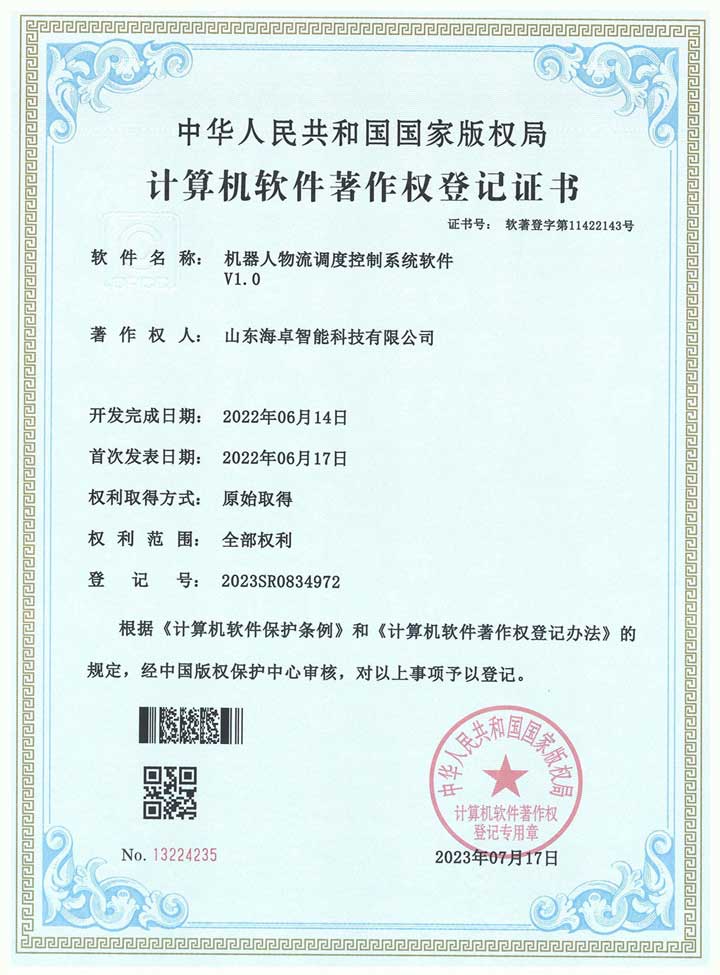 机器人物流调度控制系统软件 软件著作权登记证书
