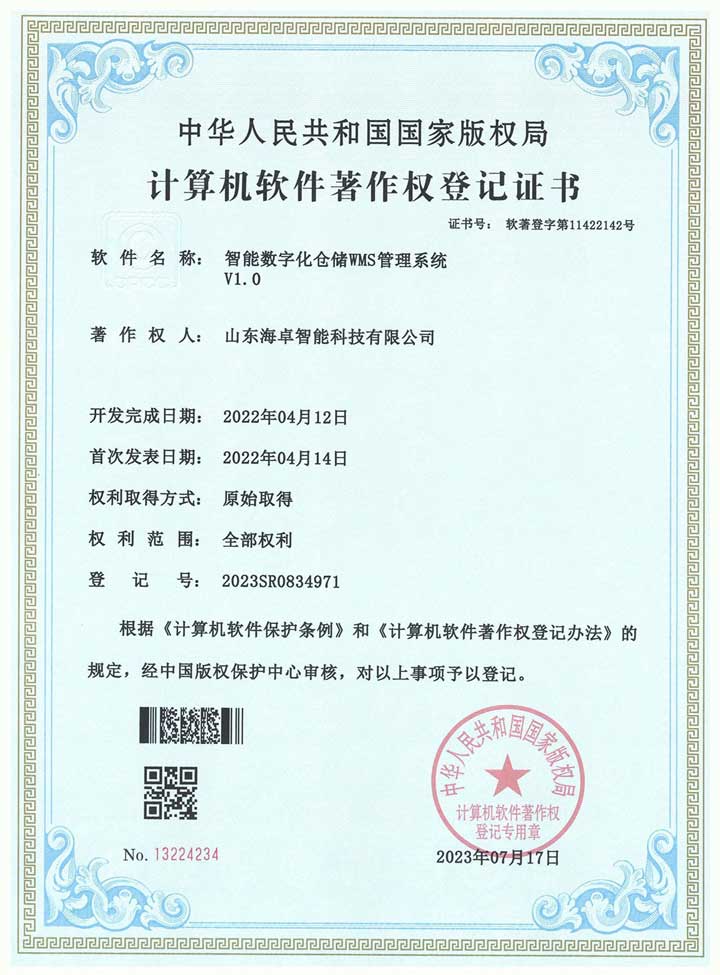 智能数字化仓储管理系统 软件著作权登记证书